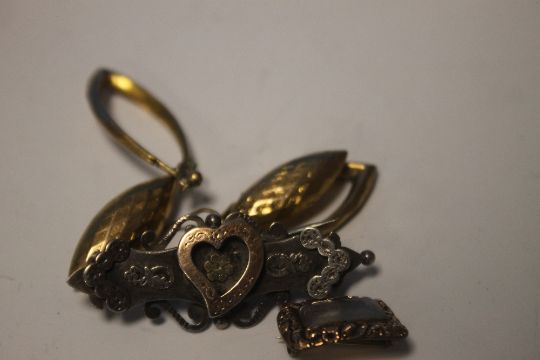 A SMALL BOX OF WHITE AND YELLOW METAL JEWELLERY TO INCLUDE A SILVER BROOCH