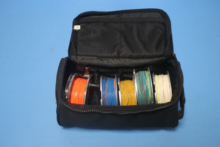 A GREYS GRXI+ 7/8 CARTRIDGE SPOOL FLY REEL and four spare spools not marked in zipped padded pouch