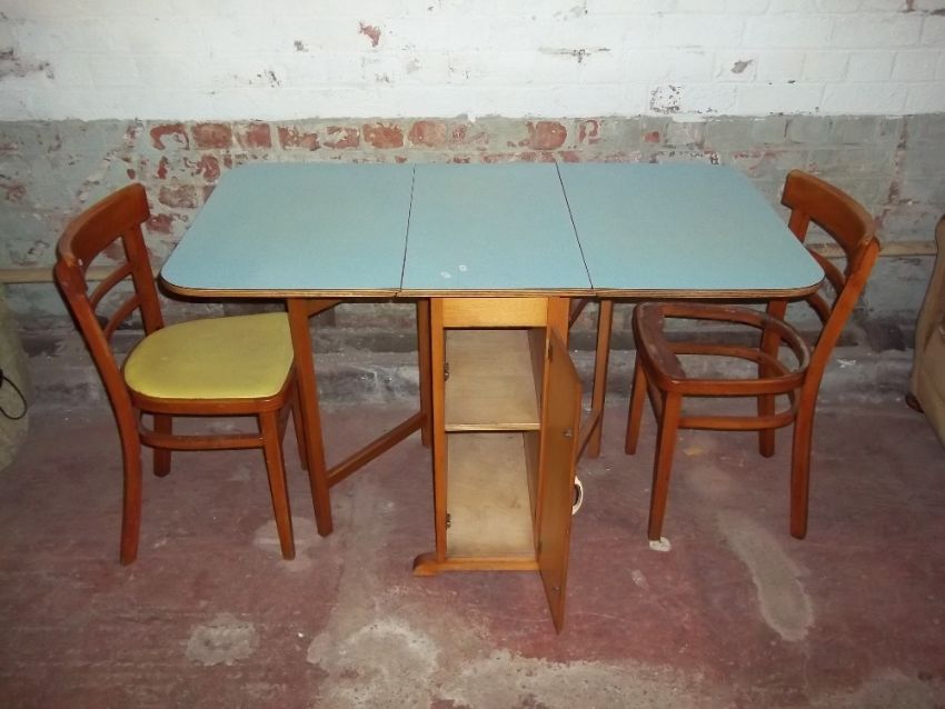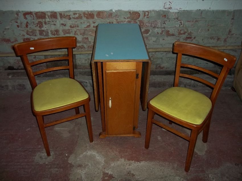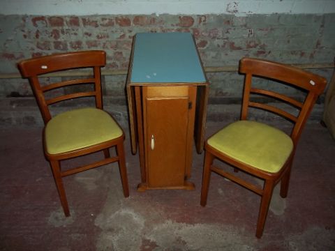 A VINTAGE RETRO FORMICA DROP LEAF KITCHEN TABLE AND TWO CHAIRS WITH STORAGE