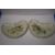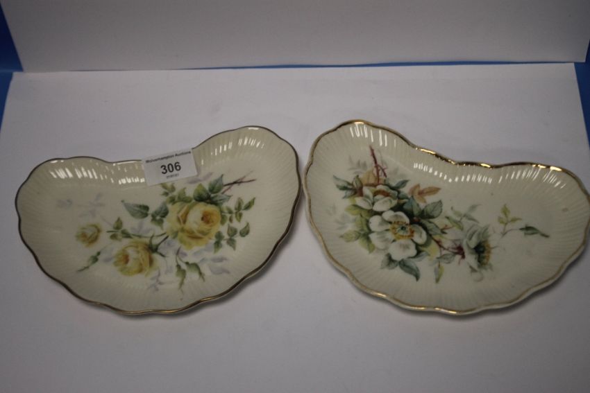 A PAIR OF BELLEEK KIDNEY SHAPED PLATES WITH DECORATIVE FLORAL DESIGN AND BLACK MARKS TO BASE Condition Report: There is rubbing to the gilding, slight spotting but no other obvious damage or restoration