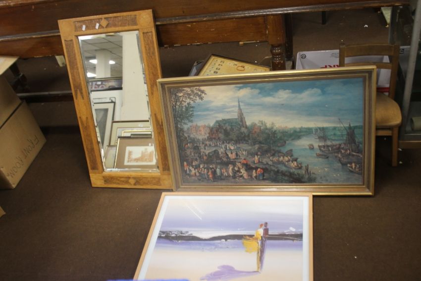 A CARVED WOOD FRAMED MIRROR AND TWO PICTURES