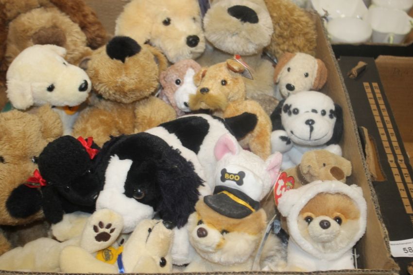 A BOX OF SOFT TOYS, to include Ty Beanies, Russ, Andrex puppies, Boo etc.