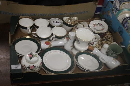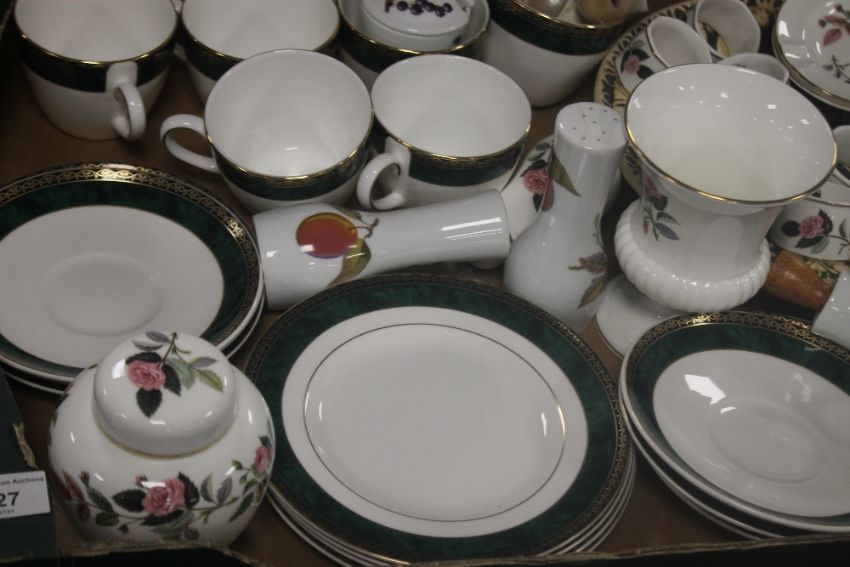 A TRAY OF CERAMICS TO INCLUDE WEDGWOOD (TRAYS NOT INCLUDED)