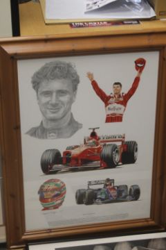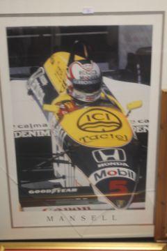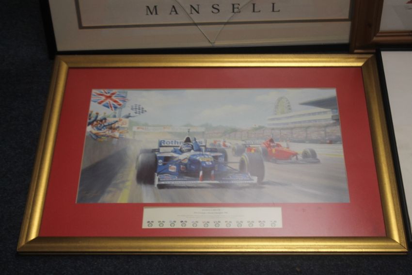 A LARGE FRAMED NIGEL MANSELL POSTER, 109 x 79.5 cm including frame, together with a FRAMED RACING INTEREST PRINTS ENTITLED ,'TRIBUTE TO EDDIE IRVINE' BY STUART MCINTYRE and 'Damon's Dream' by Tony Smith (2)Condition Report:Glass in frame is cracked