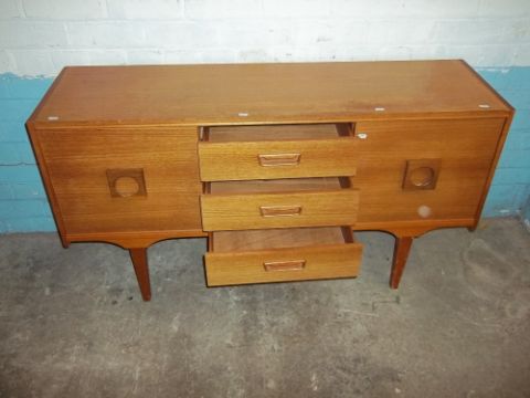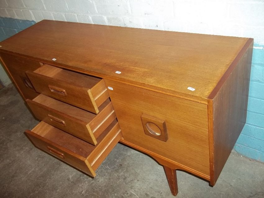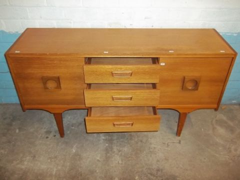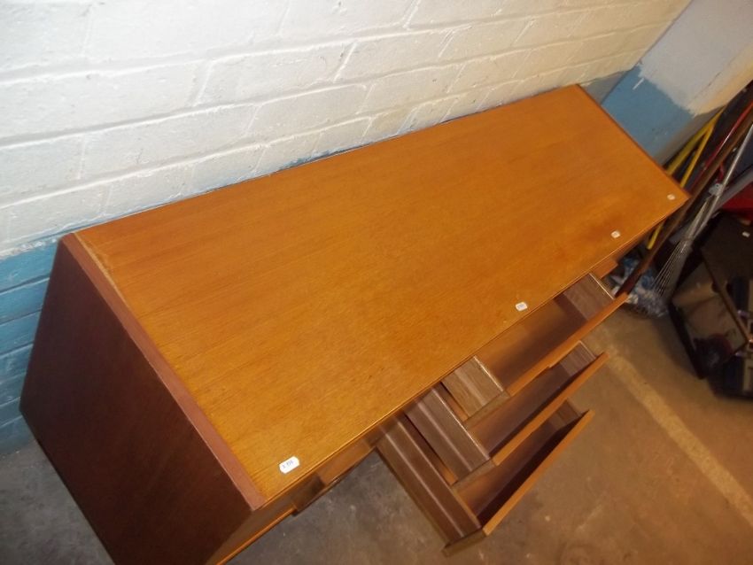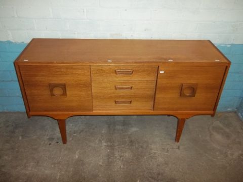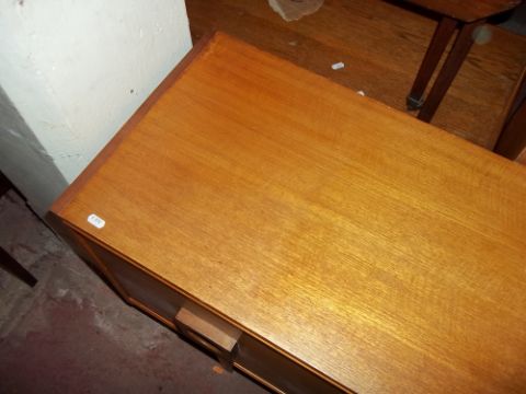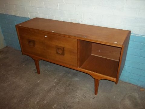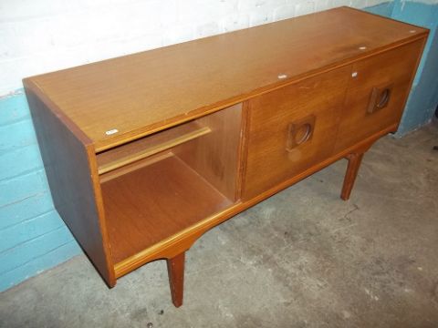 A RETRO TEAK SIDEBOARD WITH SLIDING DOORS. LENGTH 137 CM