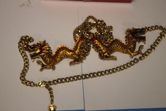 BUTLER AND WILSON BOXED GOLD TONE ENAMEL DOUBLE DRAGON NECKLACE