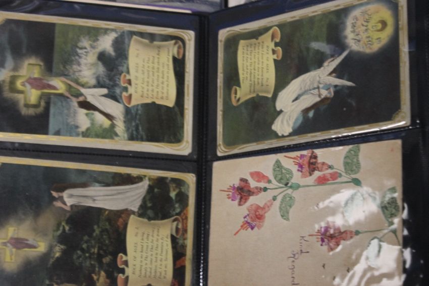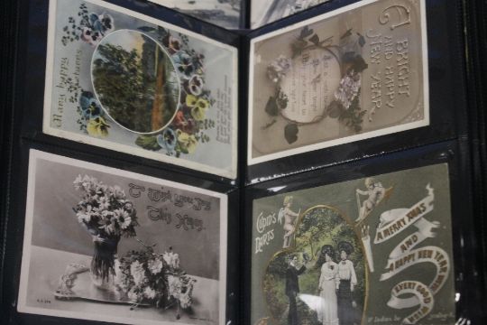 TWO ALBUMS OF POSTCARDS, GREETINGS CARDS ETC to include European views, humorous, Margaret Tarrant, silk examples, first world war etc.