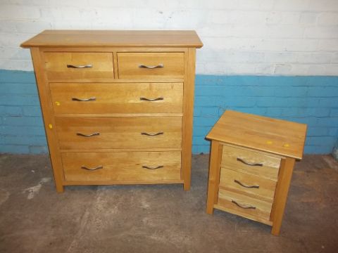 A MODERN OAK FIVE DRAWER, 2 OVER 3 DRAWER CHEST, A THREE DRAWER CHEST BEDSIDE CABINET AND A CHEVAL MIRROR, MATCHES LOT 841
