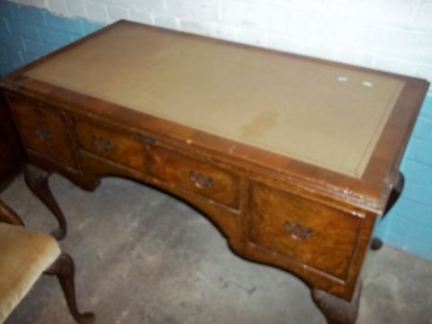 A REPRODUCTION QUEEN ANNE STYLE LEATHER INLAID DESK WITH MATCHING CHAIR