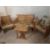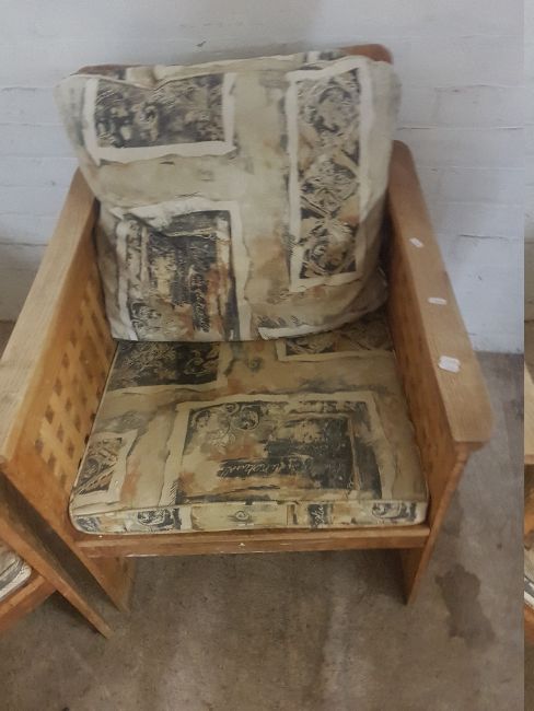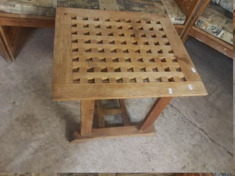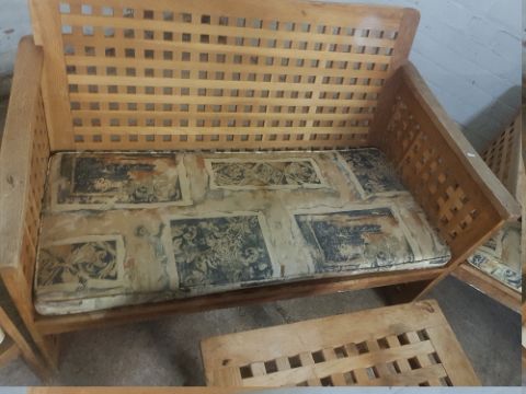 AN OAK MODERN LATTICE STYLE GARDEN SUITE COMPRISING TWO SEATER, TWO CHAIRS AND A TABLE