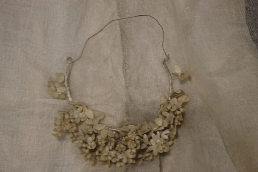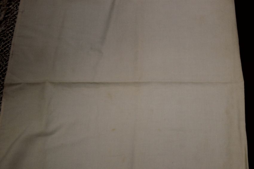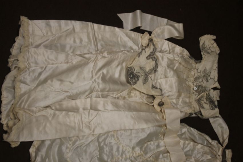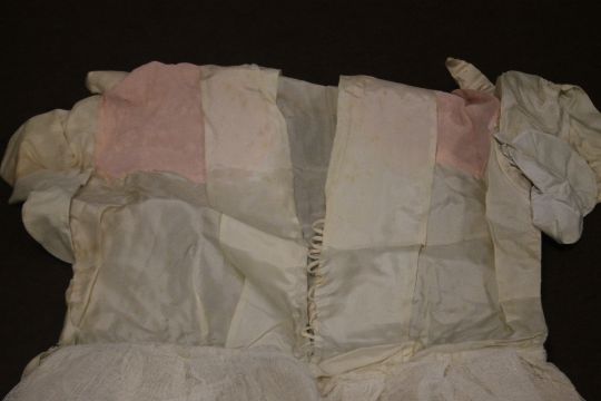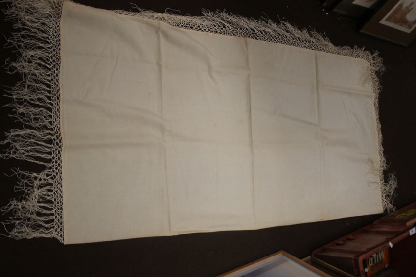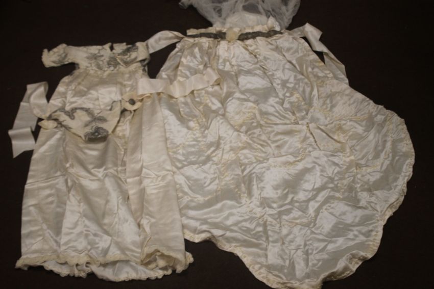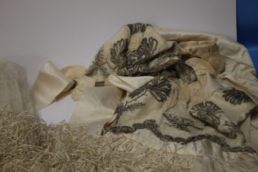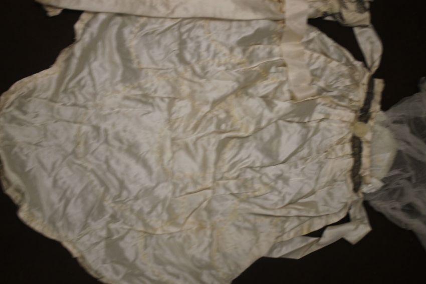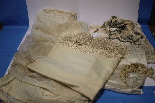 A VINTAGE WEDDING DRESS, A SHAWL, A HEAD BAND ETC Condition Report:  There is various yellow staining and some damage to the tiara