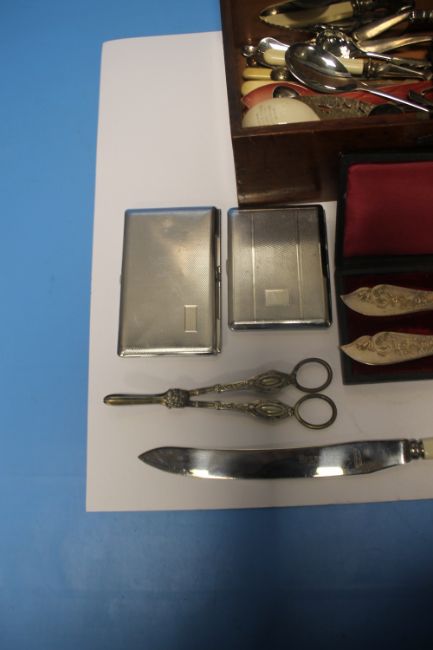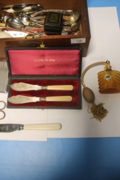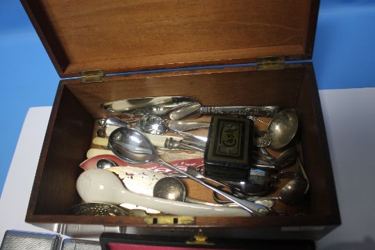 A MAHOGANY BOX OF COLLECTABLES, to include grape scissors, silver handle cake slice etc
