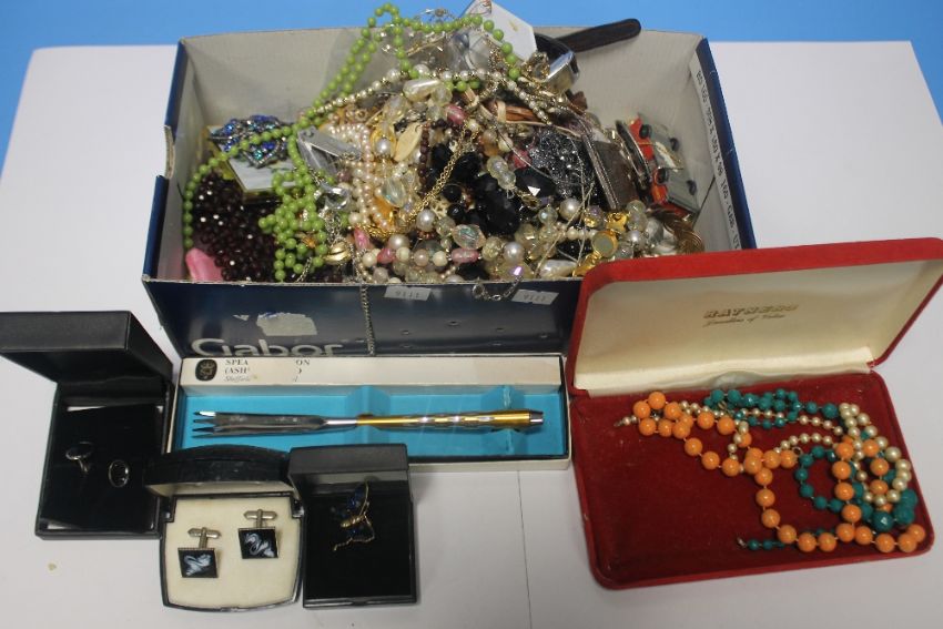 A BOX OF ASSORTED COSTUME JEWELLERY MAINLY NECKLACES AND CUFFLINKS ETC