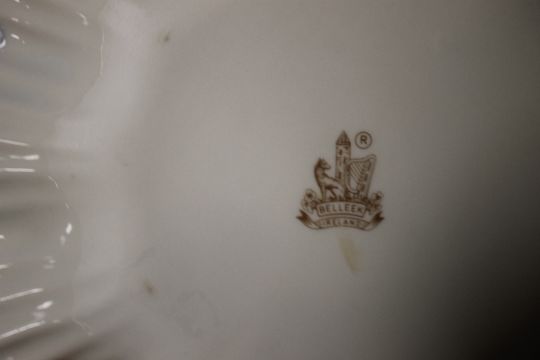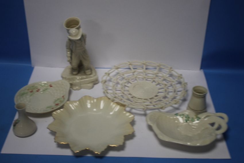 SEVEN BELLEEK ITEMS, TO INCLUDE PLATES, FIGURE ETC, ALL WITH BROWN STAMP TO BASE