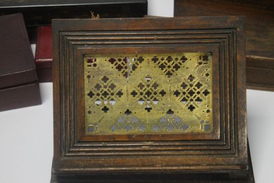 A QUANTITY OF ASSORTED STORAGE BOXES, TOGETHER WITH A BOOK STAND