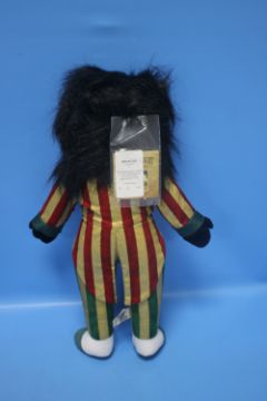 MERRYTHOUGHT GARFIELD GOLLY, 16" tall, limited edition 3/60Originally handmade by mothers in Africa for their children from old fabric and cloth, the golly doll was adopted as the mascot and trademark for the Robertson's confectionery brand around 1910 after the company's founder John Robertson visited the US and noticed children playing with them. Gollies have been collected by people across the UK and around the world for generations but garnered a contentious image in the 1980s because of links to racism. These items are listed on the basis they are illustrative of by a gone culture in which there were different social norms. We understand the potential controversy surrounding this type of item but believe that providing transparent information about historical context fosters greater understanding of our complex cultural history.