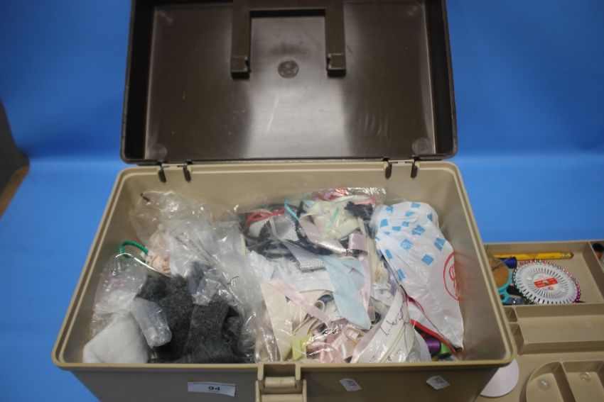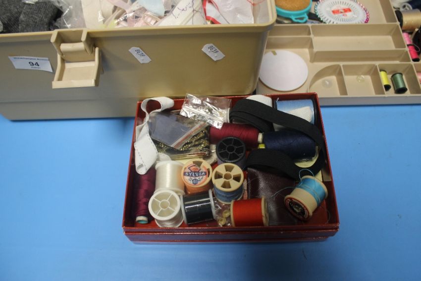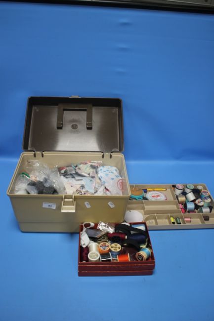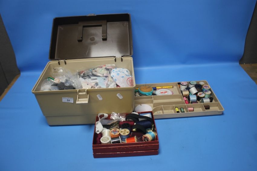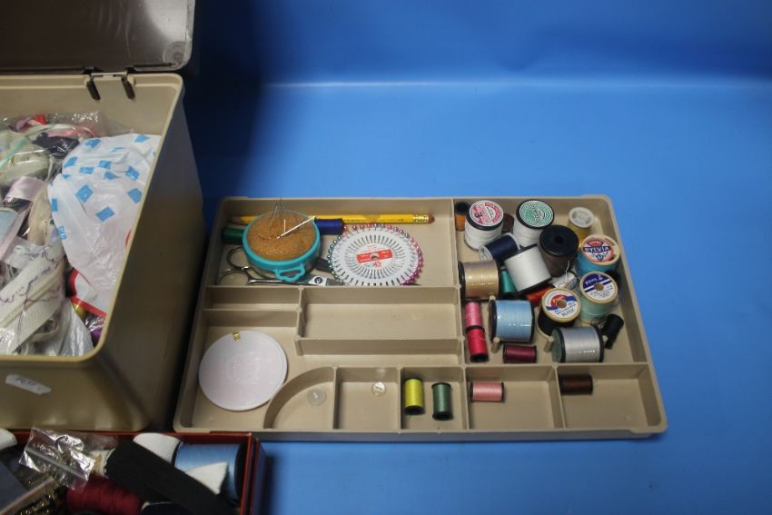 A SEWING BOX AND CONTENTS TOGETHER WITH A BOX OF COTTON REELS ETC