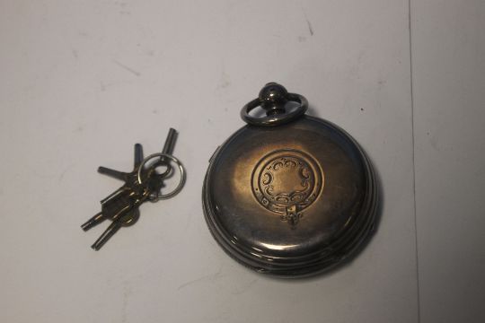 AN OVER SIZED OPEN FACE POCKET WATCH SIGNED TO THE DIAL AND MOVEMENT AND A QUANTITY OF WATCH KEYS