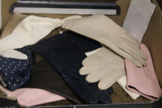 A TRAY OF ASSORTED VINTAGE PAIRS OF GLOVES mainly leather to include Milore, Elless, Dent Fownes, (17) together with a box of scarves