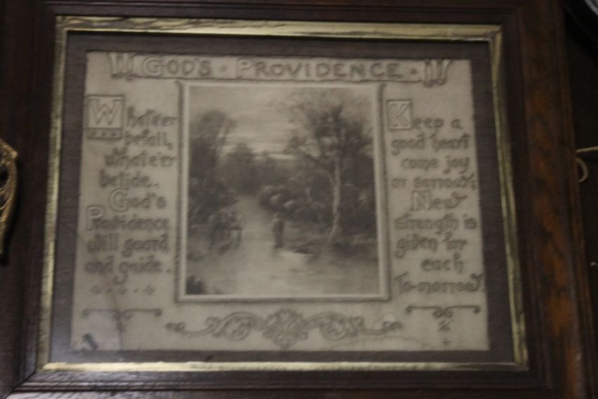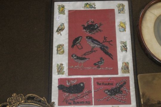 A BEAD PICTURE OF BIRDS, together with a circular floral bead / tapestry picture, a print on glass, two oval framed photographs, one with 'Frank Tweedie, Snow Hill, Wolverhampton' label on reverse and another print of a rural scene with verse (6)