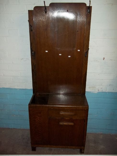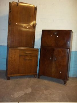A VINTAGE WALNUT COCKTAIL CABINET AND A VINTAGE OAK HALL COAT / UMBRELLA STAND WITH MIRROR