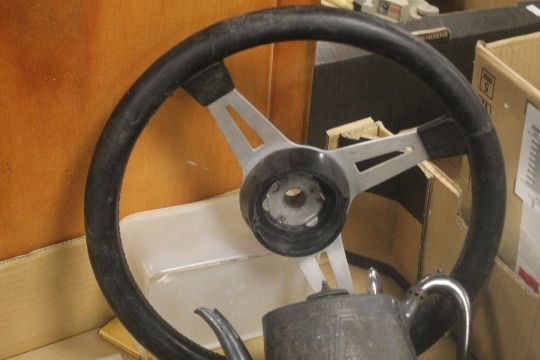 A TRAY OF COLLECTABLES TO INCLUDE A VINTAGE STEERING WHEEL, CAMERA ETC