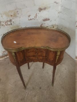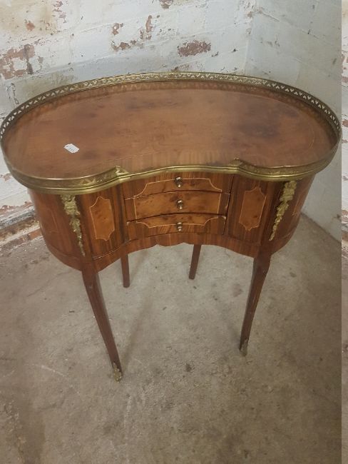 AN ORNATE INLAID KIDNEY SHAPED SIDE TABLE WITH BRASS GALLERY DETAIL