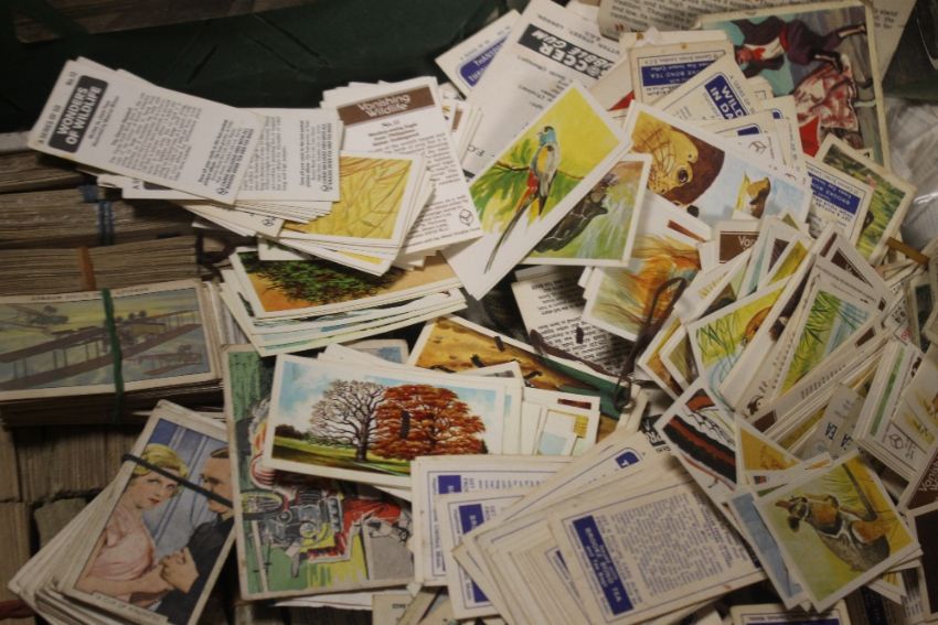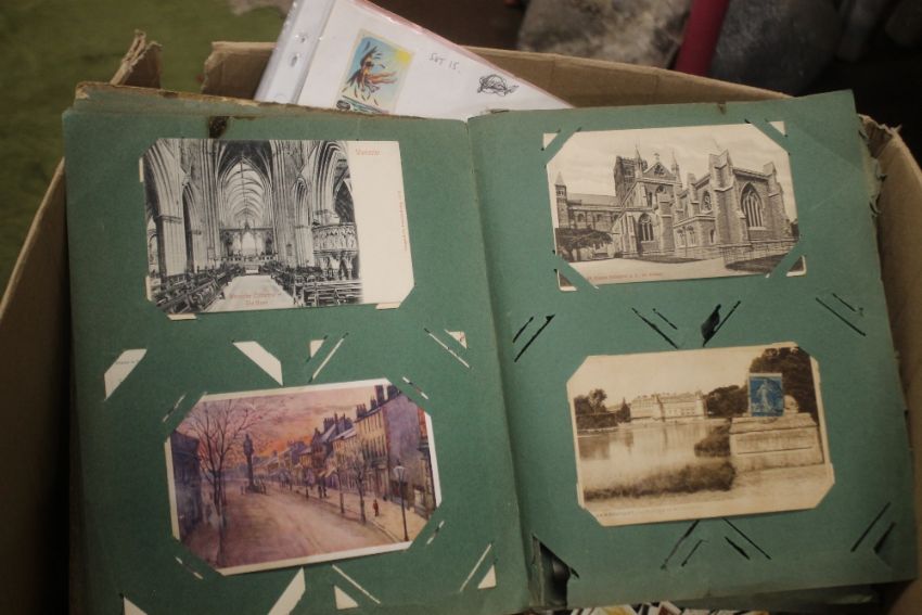 A LARGE QUANTITY OF TEA CARDS, CIGARETTE CARDS, POSTCARDS ETC IN ALBUMS AND LOOSE