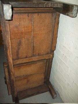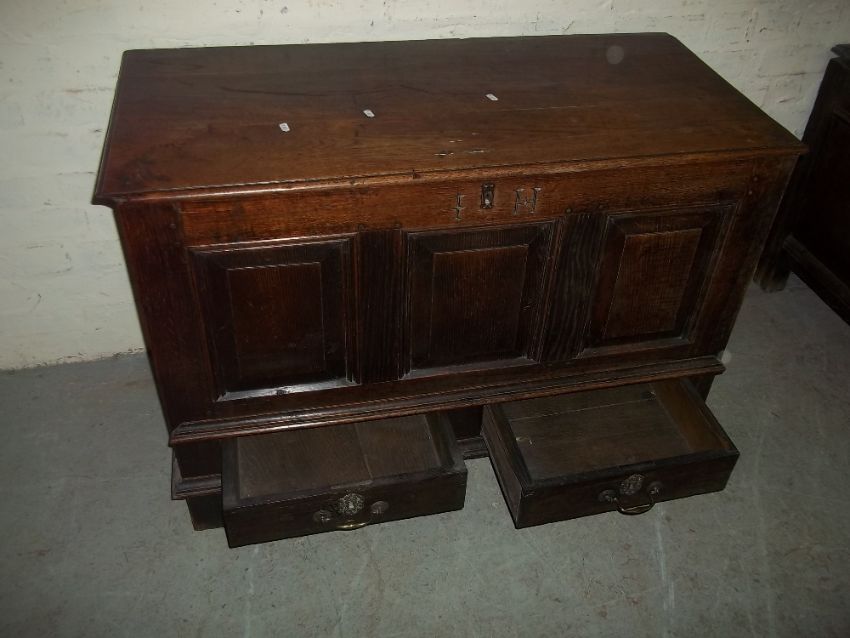 AN ANTIQUE OAK COFFER / BLANKET CHEST / MULE CHEST WITH TWO DRAWERS
