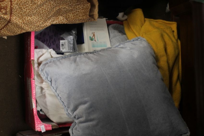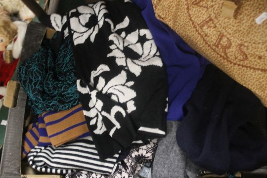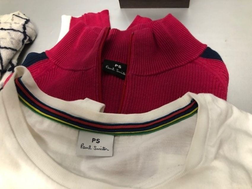 A QUANTITY OF ASSORTED CLOTHING ETC, BRANDS INCLUDE JAEGER, BASSINI, M & S, A SAVILLE ROW TIE ETC. PLEASE NOTE INSIDE THE PENELOPE CHIVERS BAG ARE A PAUL SMITH T-SHIRT, PAUL SMITH TOP AND A PURE CASHMERE CARDIGAN WITH VARIOUS OTHER TOPS