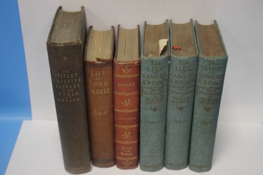 HISTORY INTEREST BOOKS TO INCLUDE CREASY - 'THE FIFTEEN DECISIVE BATTLES OF THE WORLD', Low - 'Life of Lord Wolseley', Headlam - 'Bismark', and 'The Life of Samuel Johnson' by Boswell Vols. I, II & III (6)