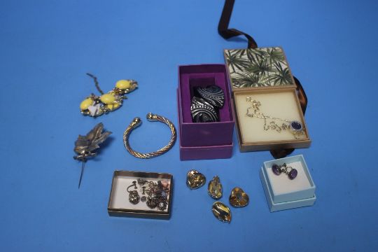 A BOX OF ASSORTED COSTUME JEWELLERY TO INCLUDE BROOCHES BANGLES ETC