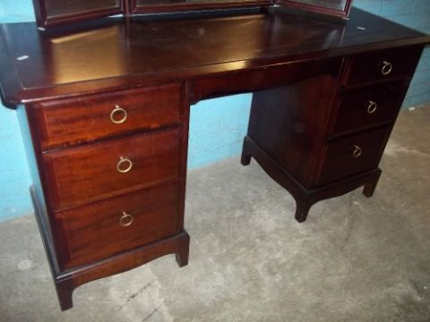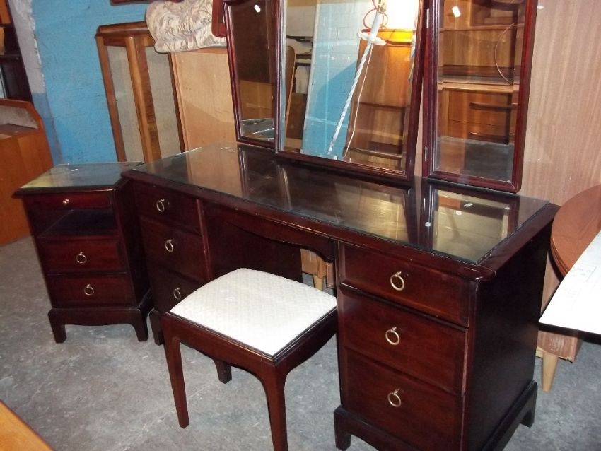 A STAG MINSTREL TRIPLE MIRROR DRESSING TABLE AND STOOL WITH A TWO DRAWER BEDSIDE CHEST