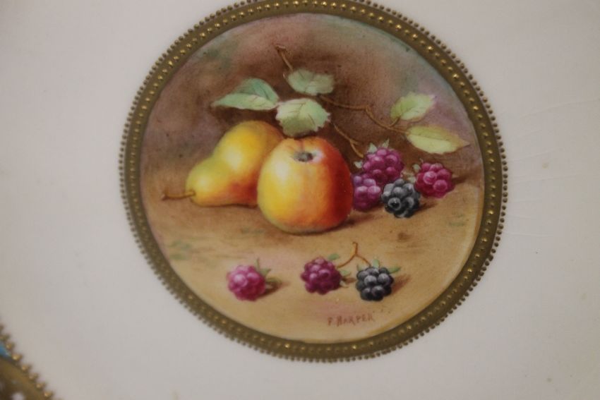 TWO ROYAL DOULTON CABINET PLATES, ONE DEPICTING FRUIT SIGNED F HARPER Condition Report: The plate with fruit on has some slight surface scratches and small areas of spotting and crazing.  No obvious visual damage or restoration.  The other has various scratches and spotting.
