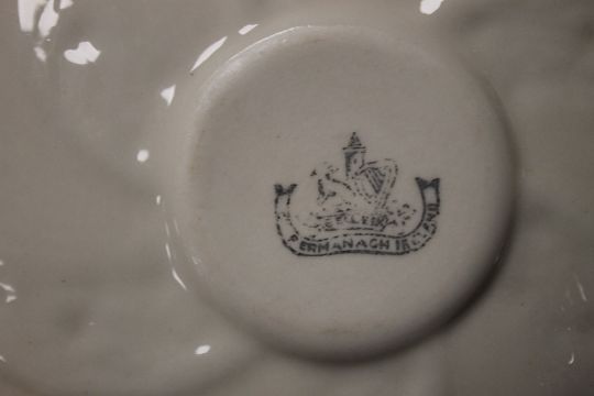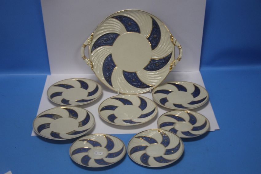 EIGHT BELLEEK BLUE AND CREAM PLATES AND SAUCERS WITH BLACK MARKS TO BASECondition Report : There are slight areas of rubbing to the gilding and slight spotting but no obvious visual damage or restoration