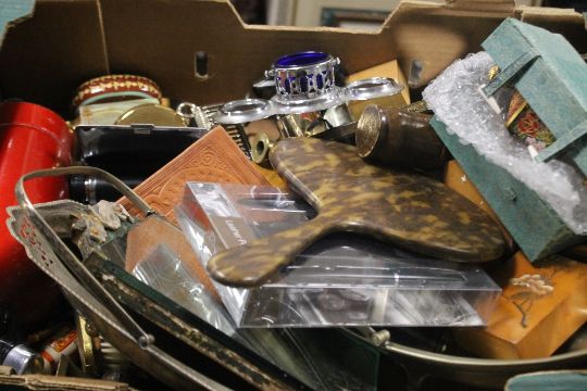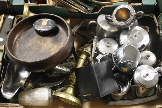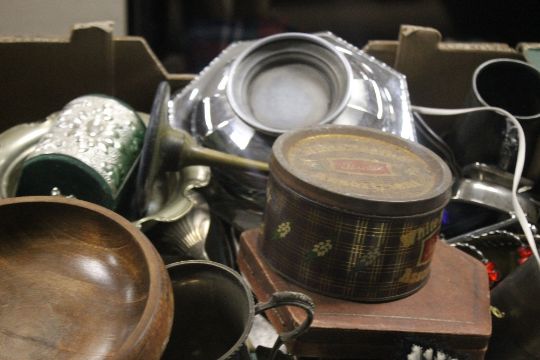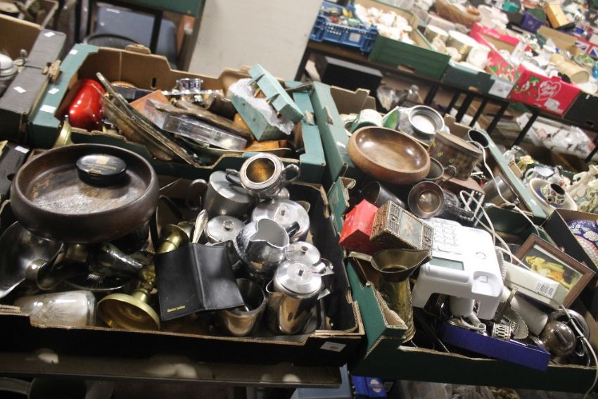 FOUR TRAYS OF ASSORTED METALWARE AND TREEN ITEMS ETC (TRAYS NOT INCLUDED)