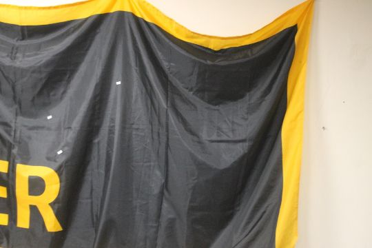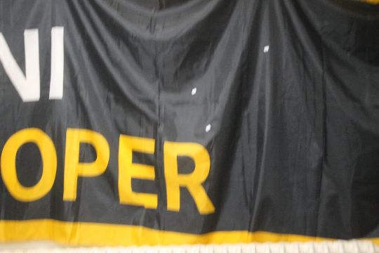 A MINI COOPER ORIGINAL DEALERS SHOWROOM BANNER, in gold, black and white, approx. 145 x 350 cm