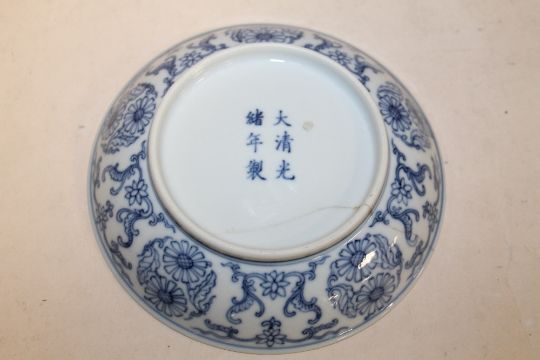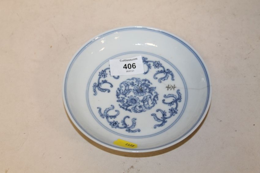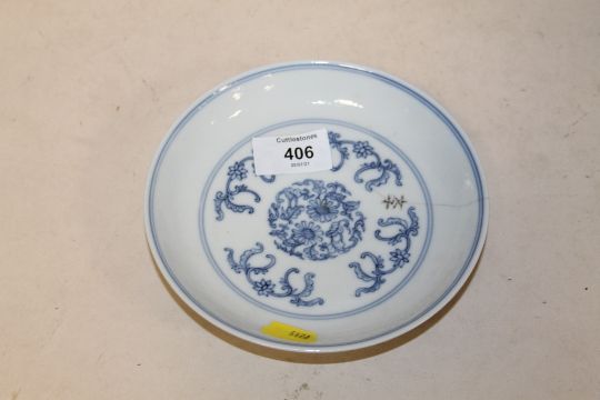 A CHINESE BLUE AND WHITE SMALL SHALLOW DISH WITH SIX CHARACTER MARK TO BASE (LONG HAIRLINE CRACK)