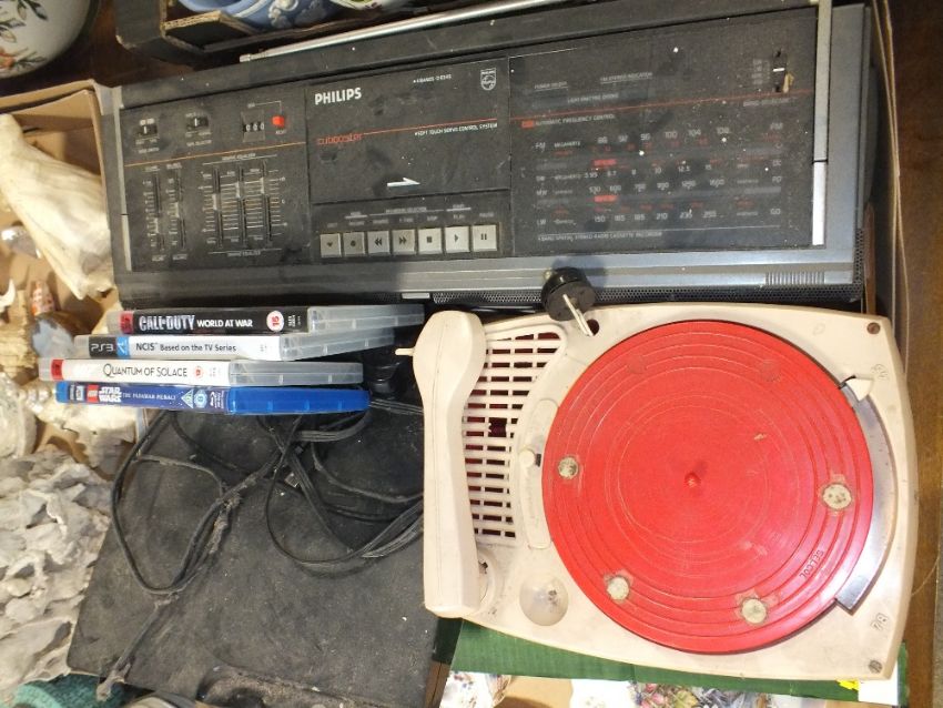 A SONY PS3 CONSOLE AND GAMES, TOGETHER WITH A PHILIPS RADIO AND A VINTAGE GOLDENTONE RECORD PLAYER (H/C)