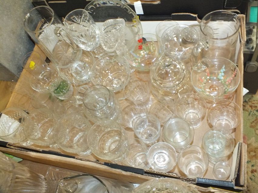 THREE TRAYS OF ASSORTED GLASSWARE TO INCLUDE A CUT GLASS DECANTER, SILVER RIMMED VASE, CUT GLASS JUGS ETC.