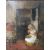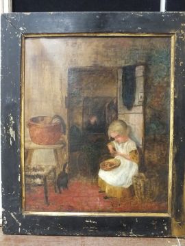(XIX) ENGLISH SCHOOL. Cottage interior scene with young girl peeling vegetables, and a black cat, unsigned, oil on canvas, framed, 34 x 28 cm