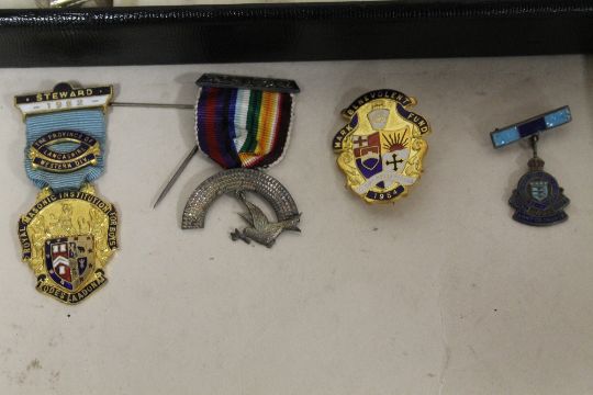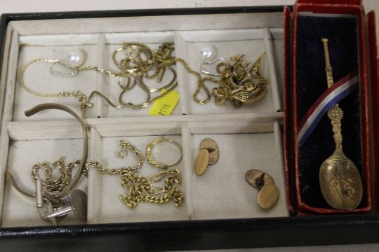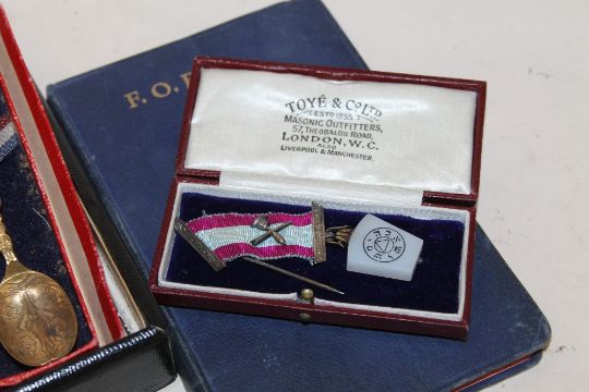 A COLLECTION OF MASONIC JEWELS/ MEDALS TO INCLUDE A HTWSSTKS ROYAL ARCH MASONRY ISRAELI SILVER PLATED MEDAL IN FITTED CASE, PEACE MEDAL ETC. TOGETHER WITH A BOX OF COLLECTABLES AND COSTUME JEWELLERY TO INCLUDE A PAIR OF ROLLED GOLD CUFFLINKS, ANOINTING SPOON ETC.