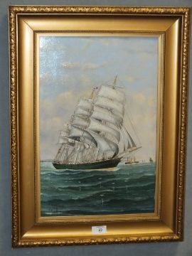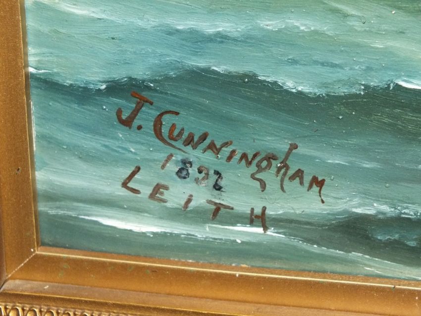 A GILT FRAMED OIL ON BOARD OF SAILING VESSELS AT LEITH BY J. CUNNINGHAM SIZE - 46CM X 30CM