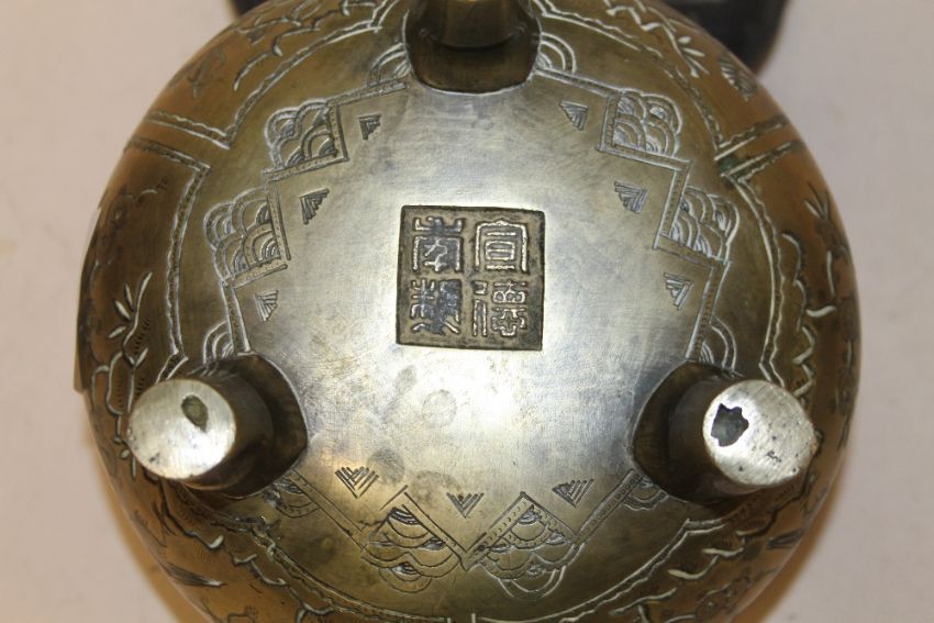 AN CHINESE BRASS CENSOR ON STAND, IMPRESSED FOUR CHARACTER MARK TO BASE, HOLE IN MAIN BODY