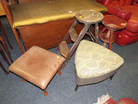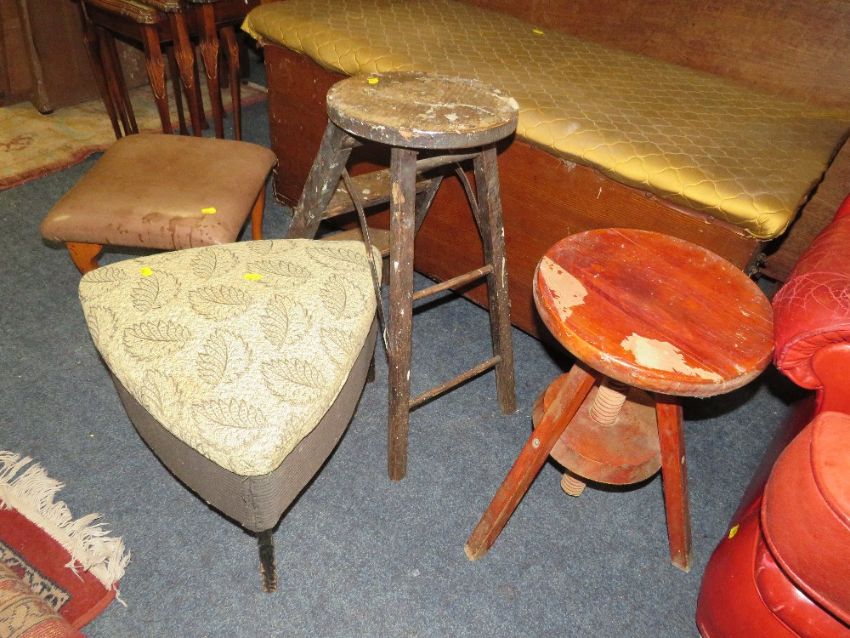 AN ANTIQUE PINE BLANKET BOX WITH PADDED LID L-115 CM WITH 3 OCCASIONAL STOOLS AND A SEWING BOX (5)