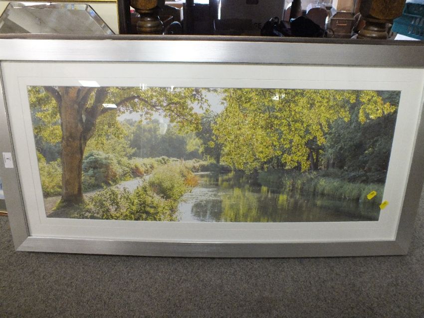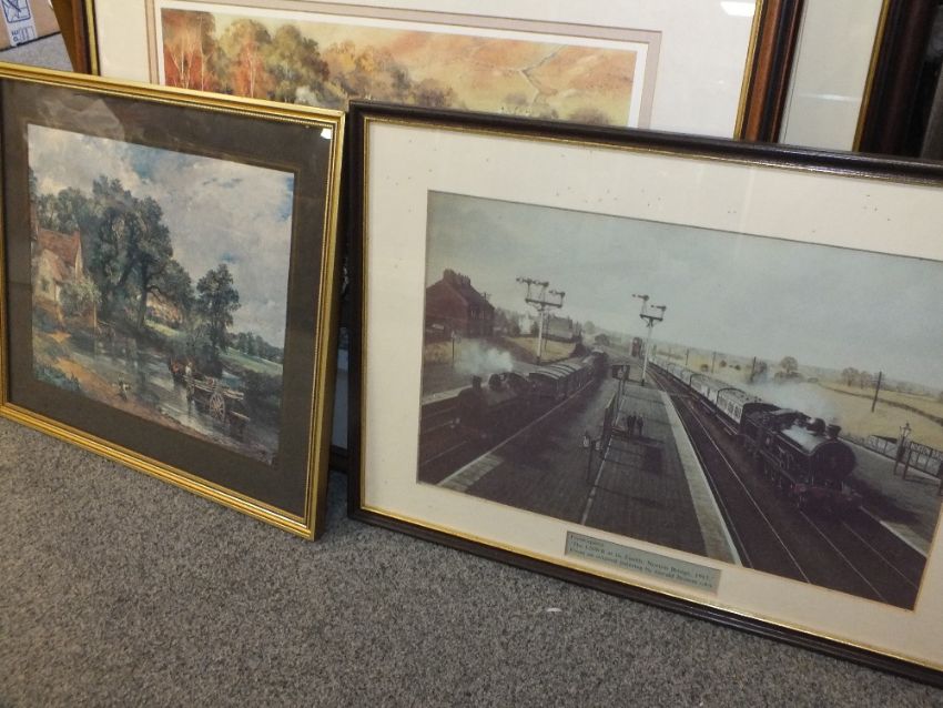 A QUANTITY OF ASSORTED PICTURES AND PRINTS TO INC A MODERN WOODLAND SCENE WITH TEXTURED GLASS, OAK BEVELLED WALL MIRROR, STAFFORDSHIRE MAP ETC.. (12)