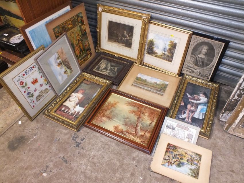A COLLECTION OF ASSORTED PICTURES AND PRINTS TO INCLUDE ANTIQUE ENGRAVINGS, WATERCOLOURS, RIVER SCENE OIL ON CANVAS ETC.