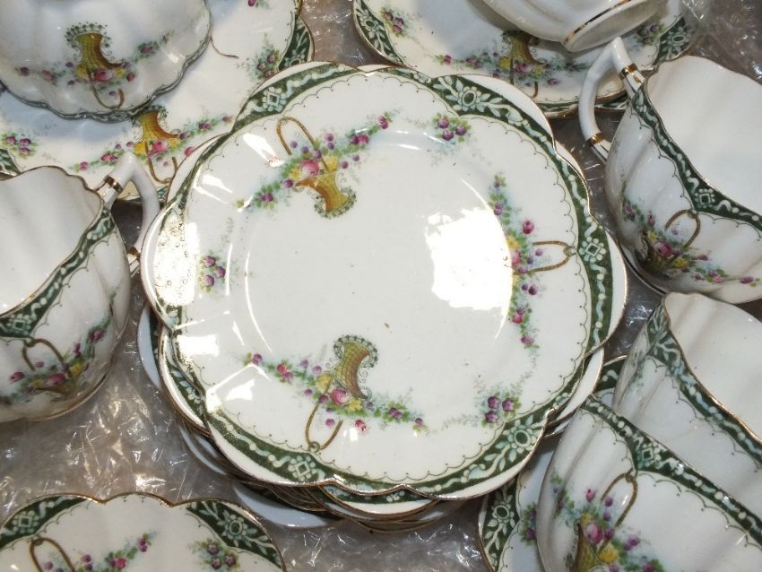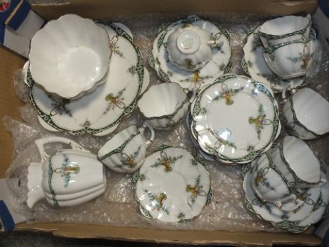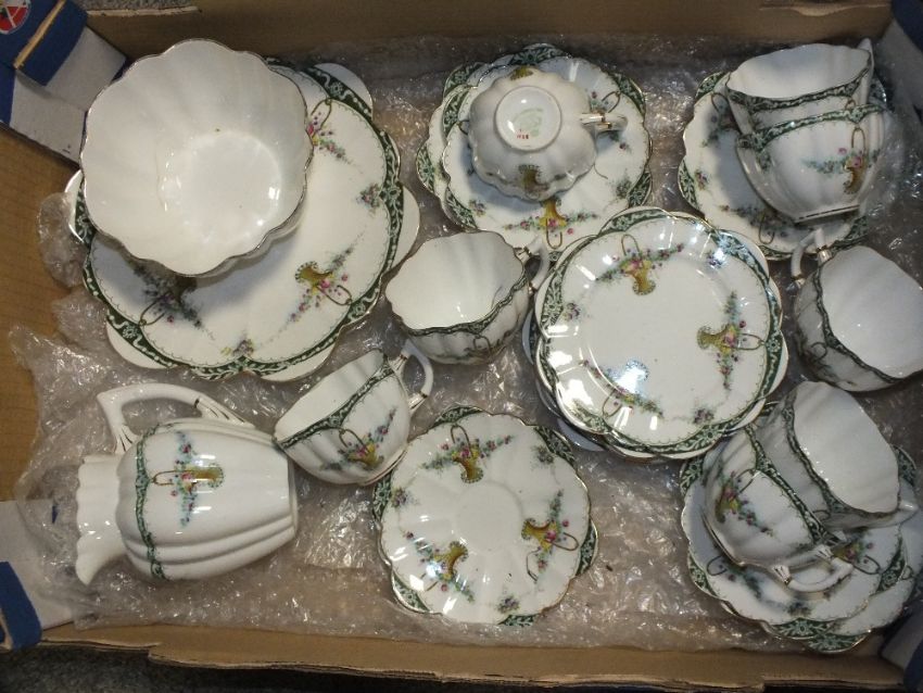 A TRAY OF ANTIQUE THE PARAGON CHINA TO INCLUDE TRIOS, CAKE PLATE, JUG AND BOWL ETC.
