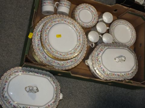 A TRAY OF SPODE SHARRATON PATTERN CHINA TO INCLUDE TUREENS, DINNER PLATES, CUPS AND SAUCERS ETC.