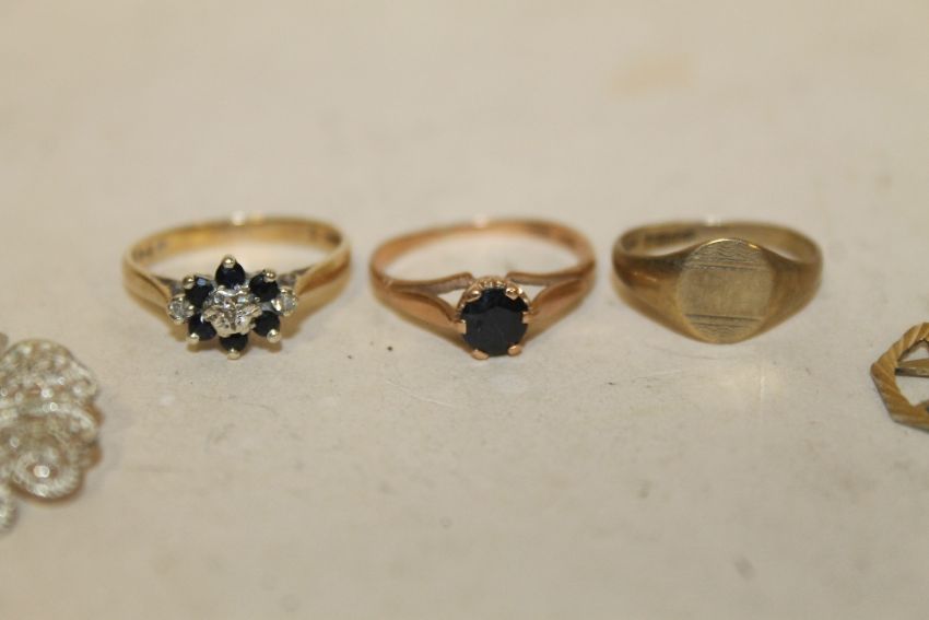 THREE SMALL HALLMARKED 9 CT GOLD RINGS, ONE BEING ROSE GOLD, APPROX COMBINED WEIGHT 4.4 G TOGETHER WITH AN UNMARKED YELLOW METAL MALTESE CROSS PENDANT AND A FILIGREE PENDANT (5)
